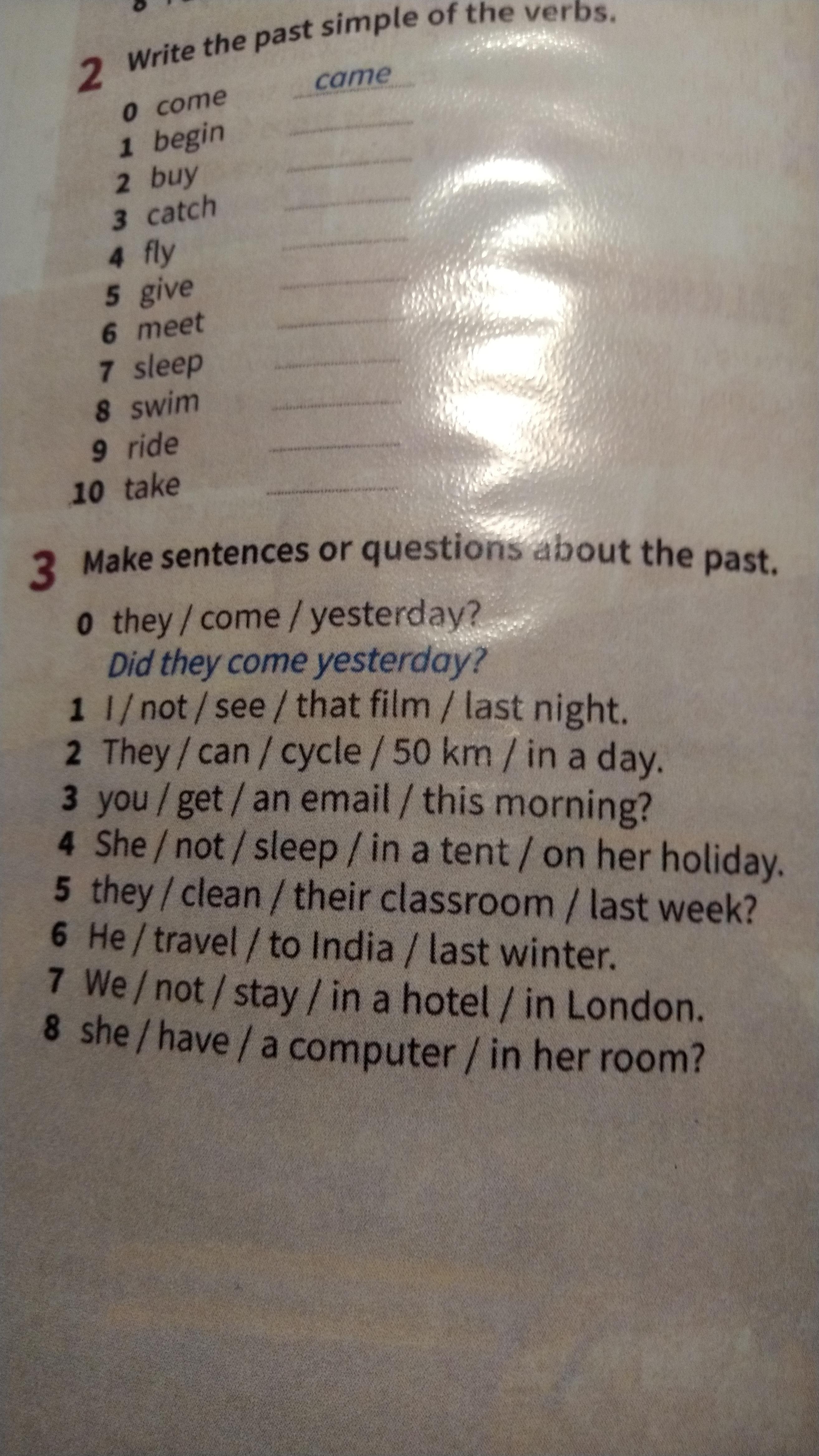 She didn't sleep in a tent on her holiday.Did they clean their classroom last week ?He travelled to India last summer.We didn't stay in a hotel in London.Did she have a computer in her room?