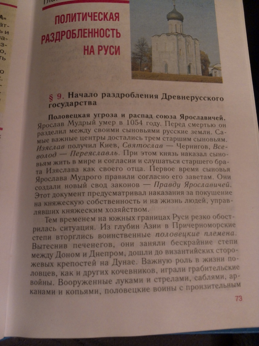 Наказал сыновьям жить в мире, согласии, слушаться старшего брата ¨Сыновья создали новый свод законов – ПРАВДУ ЯРОСЛАВИЧЕЙ, где определили наказание за покушение на княжескую собственность и на жизнь людей, управляющих княжеским хозяйством. Внешняя угроза со стороны половцев заставляла сыновей Ярослава крепко держаться вместе и не допускать ослабления государства.
