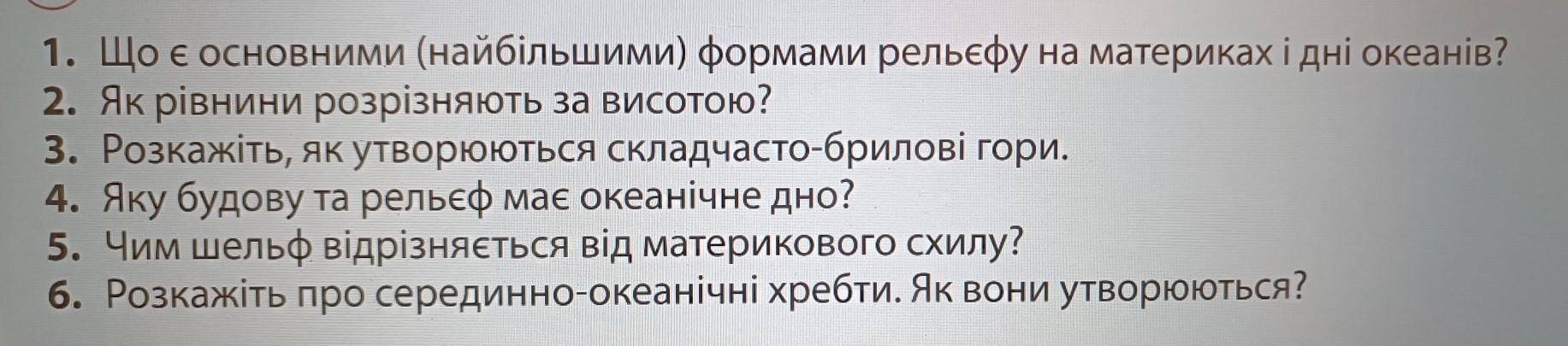 4. Хребти, розколини і долини. Основні частини дна — шельф, материковий схил, ложе океану, глибоководні жолоби, серединно-океанічні хребти, підводні улоговини та океанічні плато.