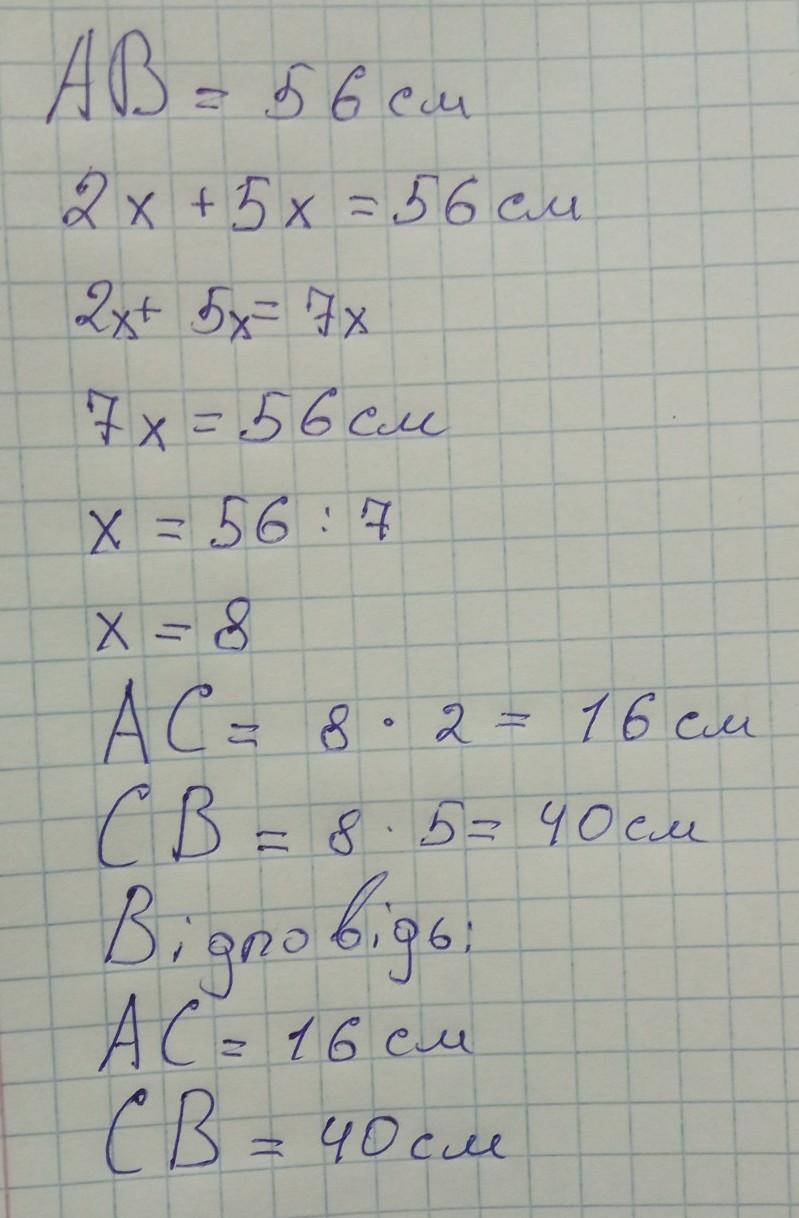 срочно Довжина відрізка AB = 56 см, точка С є внутрішньою точкою відрізка AB. Знайти відрізки AC і CB, якщо відомо, що вони відносяться, як 2:5. 50б