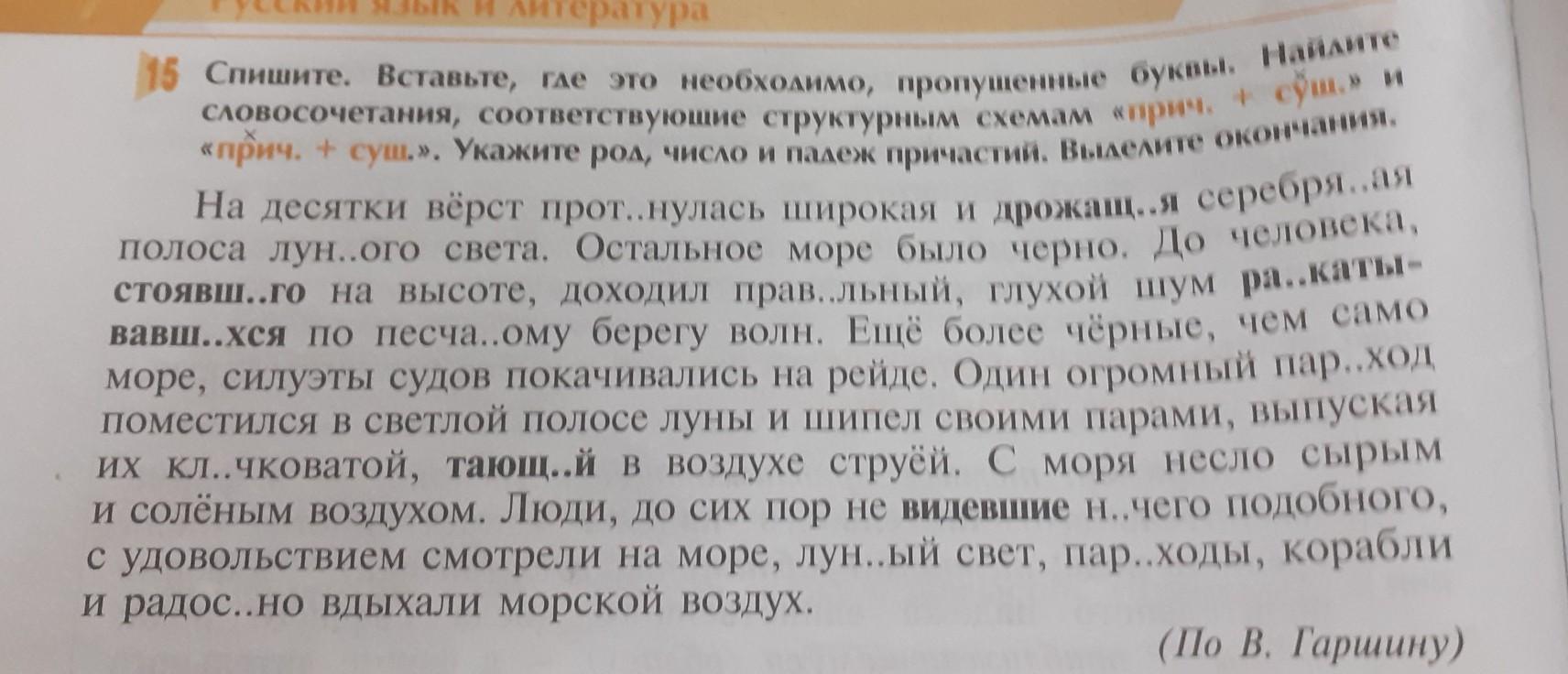 Протянулась, дрожащая И.п., ед.ч., ж.р., серебряная, лунного, стоявшего Р.п., ед.ч., м.р., правильный, раскатывавшихся Р.п., мн.ч. , песчаному, пароход, клочковатой, тающей Т.п., ед.ч., ж.р., ничего, лунный, пароходы, радостно.