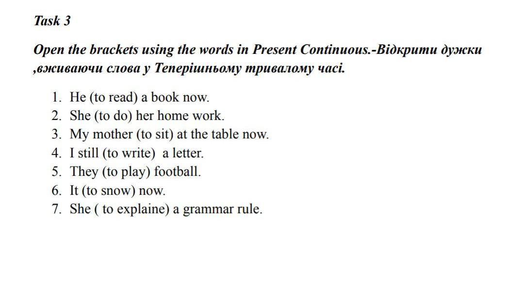 1. reading 2. doing 3. sitting 4. writing 5. playing 6. snowing 7. explaining