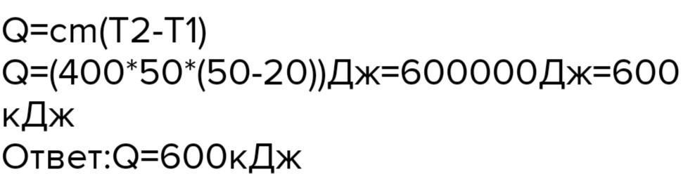 Q = m*c*(t2-t1) = 0.4*400*(85 - 25) = 9.6 кило Джоулей