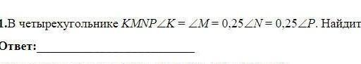 Как известно, сумма углов в четырехугольнике равна 360°. Если обозначить углы K и M буквой x, то углы N и P по условию будут равны 4x, а. тогда все углы в сумме дают 10x. Итак,
