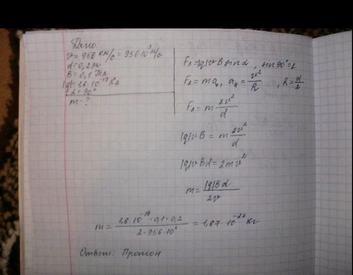 Іонізована частинка рухається зі швидкістю 956 км/с по колу радіусом 19 см