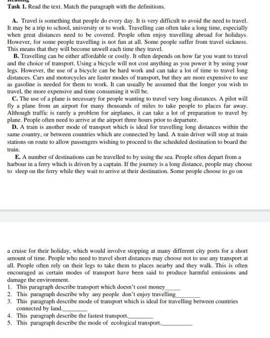 Reading Task 1. Read the text. Match the paragraph with the definitions. A. Travel is something that people do every day. It is very difficult to avoid the need to travel. It may be a trip to school, university or to work. Travelling can often take a long time, especially when great distances need to be covered. People often enjoy travelling abroad for holidays. However, for some people travelling is not fun at all. Some people suffer from travel sickness. This means that they will become unwell each time they travel. B. Travelling can be either affordable or costly. It often depends on how far you want to travel and the choice of transport. Using a bicycle will not cost anything as you power it by using your legs. However, the use of a bicycle can be hard work and can take a lot of time to travel long distances. Cars and motorcycles are faster modes of transport, but they are more expensive to use as gasoline is needed for them to work. It can usually be assumed that the longer you wish to travel, the more expensive and time consuming it will be. C. The use of a plane is necessary for people wanting to travel very long distances. A pilot will fly a plane from an airport for many thousands of miles to take people to places far away. Although traffic is rarely a problem for airplanes, it can take a lot of preparation to travel by plane. People often need to arrive at the airport three hours prior to departure. D. A train is another mode of transport which is ideal for travelling long distances within the same country, or between countries which are connected by land. A train driver will stop at train stations on route to allow passengers wishing to proceed to the scheduled destination to board the train. E. A number of destinations can be travelled to by using the sea. People often depart from a harbour in a ferry which is driven by a captain. If the journey is a long distance, people may choose to sleep on the ferry while they wait to arrive at their destination. Some people choose to go on a cruise for their holiday, which would involve stopping at many different city ports for a short amount of time. People who need to travel short distances may choose not to use any transport at all. People often rely on their legs to take them to places nearby and they walk. This is often encouraged as certain modes of transport have been said to produce harmful emissions and damage the environment. 1. This paragraph describe transport which doesn't cost money 2. This paragraph describe why any people don't enjoy travelling 3. This paragraph describe mode of transport which is ideal for travelling between countries connected by land., 4. This paragraph describe the fastest transport. 5. This paragraph describe the mode of ecological transport.