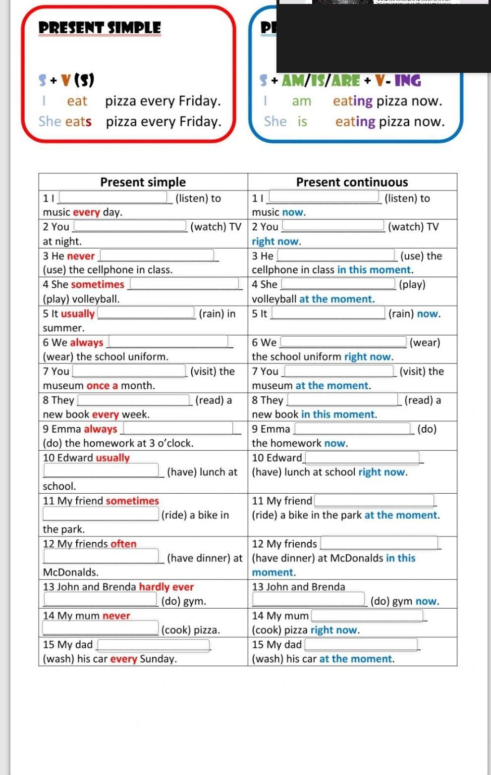 Present simple 11 music every day. 2 You at night. 3 He never (use) the cellphone in class. 4 She sometimes (play) volleyball. 5 It usually! summer. 6 We always (wear) the school uniform. 7 You museum once a month. 8 They school. 11 My friend sometimes the park. 12 My friends often (listen) to new book every week. 9 Emma always (do) the homework at 3 o'clock. 10 Edward usually 14 My mum never (watch) TV (rain) in (visit) the (read) a (have) lunch at (ride) a bike in (have dinner) at McDonalds. 13 John and Brenda hardly ever (do) gym. 15 My dad (wash) his car every Sunday. (cook) pizza.