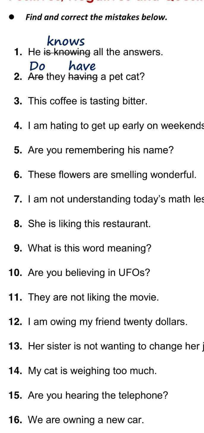 1. He is knowing all the answers. 2. Are they having a pet cat? 3. This coffee is tasting bitter. 4. I am hating to get up early on weekends. 5. Are you remembering his name? 6. These flowers are smelling wonderful. 7. I am not understanding today's math lesson 8. She is liking this restaurant. 9. What is this word meaning? 10. Are you believing in UFOs? 11. They are not liking the movie. 12. I am owing my friend twenty dollars. 13. Her sister is not wanting to change her job. 14. My cat is weighing too much. 15. Are you hearing the telephone? 16. We are owning a new car.