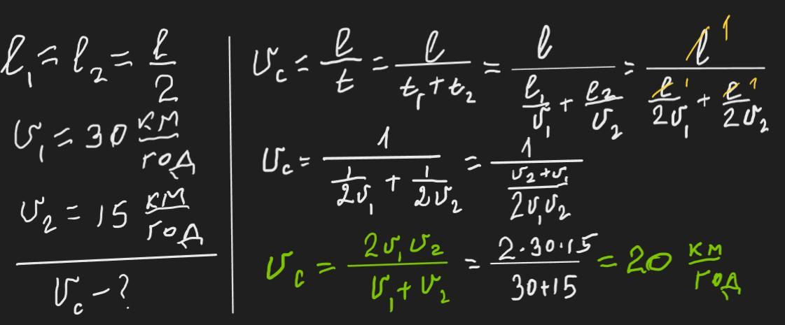 Велосипедист, рухаючись з одного пункту в інший, першу половину шляху їхав по прямій дорозі зі швидкістю 30 км/год, а другу половину шляху ішов пішки зі швидкістю 15км/год. Визначте середню швидкість руху велосипедиста.