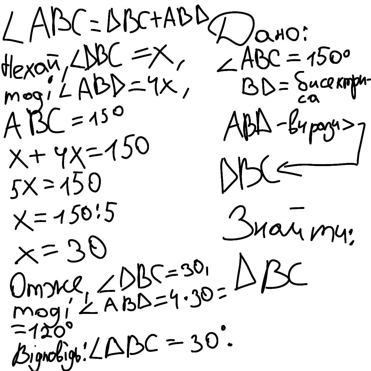 Промінь BD ділить кут АВС на два кути так, що ABD в 4 рази більший ніж DBC. Знайдіть DBC, якщо ABC = 150°