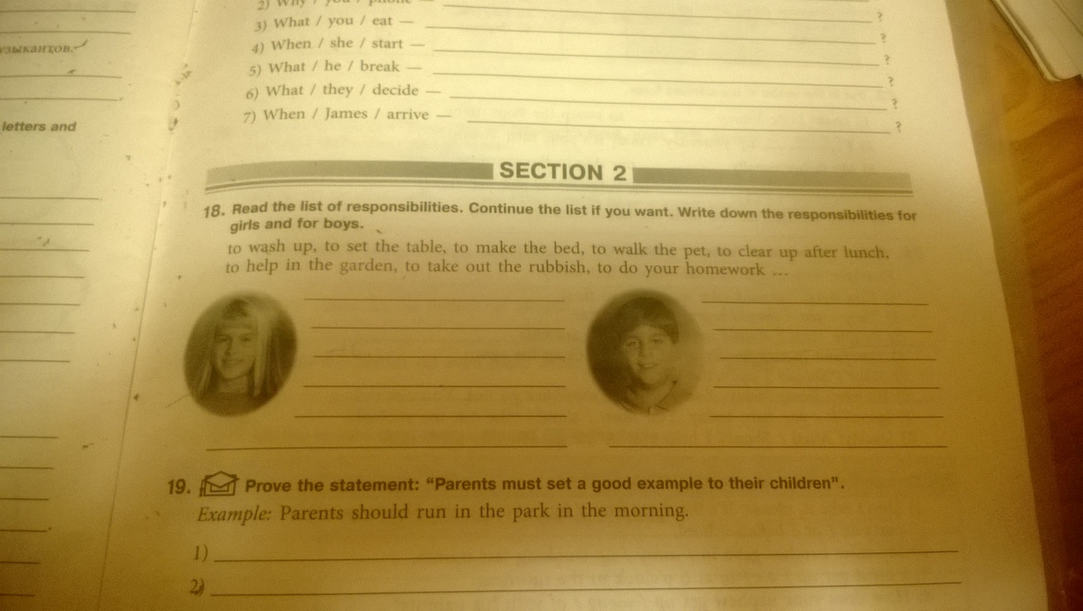 girl-to wash up,to set the tabic,to clean up after lunch,to walk the pet,to help mother to make supper,to clean her room.Ну а для мальчика все остальное