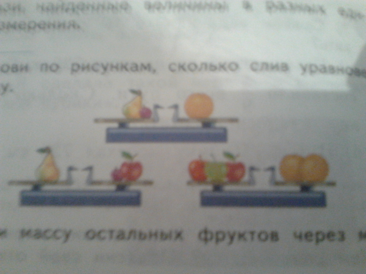1) Установи по рисункам,сколько слив уравновесят грушу.