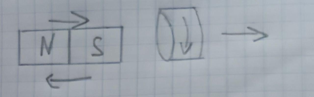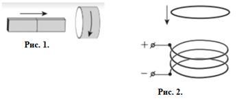 Позначте полюси стрічкового магніту, якщо при наближенні його до замкненої дротяної котушки в ній виникає індукційний струм, напрямок якого вказано на рисунку.