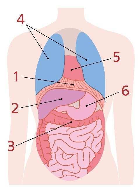 Найдите термин, которым обозначается перегородка, разделяющая туловище на грудную и брюшную полость. Какой цифрой она обозначена на рисунке?