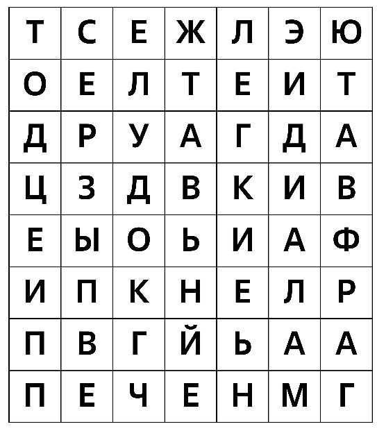 Решите головоломку. Найдите слова с названиями внутренних органов. Два слова – название органов грудной полости (соедините буквы синей линией), два слова – названия органов брюшной полости (соедините буквы зелёной линией).