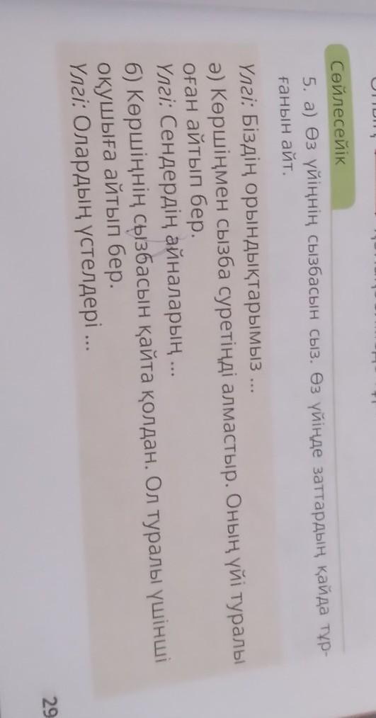 5. а) Өз үйіннің сызбасын сыз. Өз үйінде заттардын кайда тұр- ганын айт. Үлгі: Бiздiн орындықтарымыз.... ә) Көршiнмен сызба суретiндi алмастыр. Оның үйі туралы оган айтып бер. Үлгі: Сендердің айналарың... б) Көршіңнің сызбасын қайта қолдан. Ол туралы үшінші оқушыға айтып бер. Үлгі: Олардың үстелдері ... 29