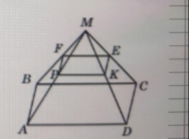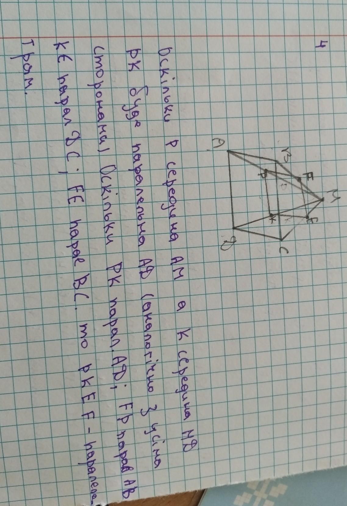 Точка M лежить поза площиною паралелограма ABCD. Точки P, F, E, K відповідно середини відрізків MA, MB, MC, MD. Визначте вид чотирикутника.