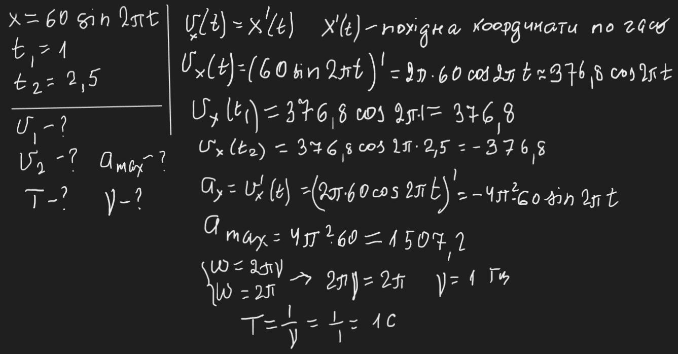Тіло здійснює гармонійні коливання x=60 sin2pt визнчіть максимальне прискорення і швидкість при t1=1 t2=2.5