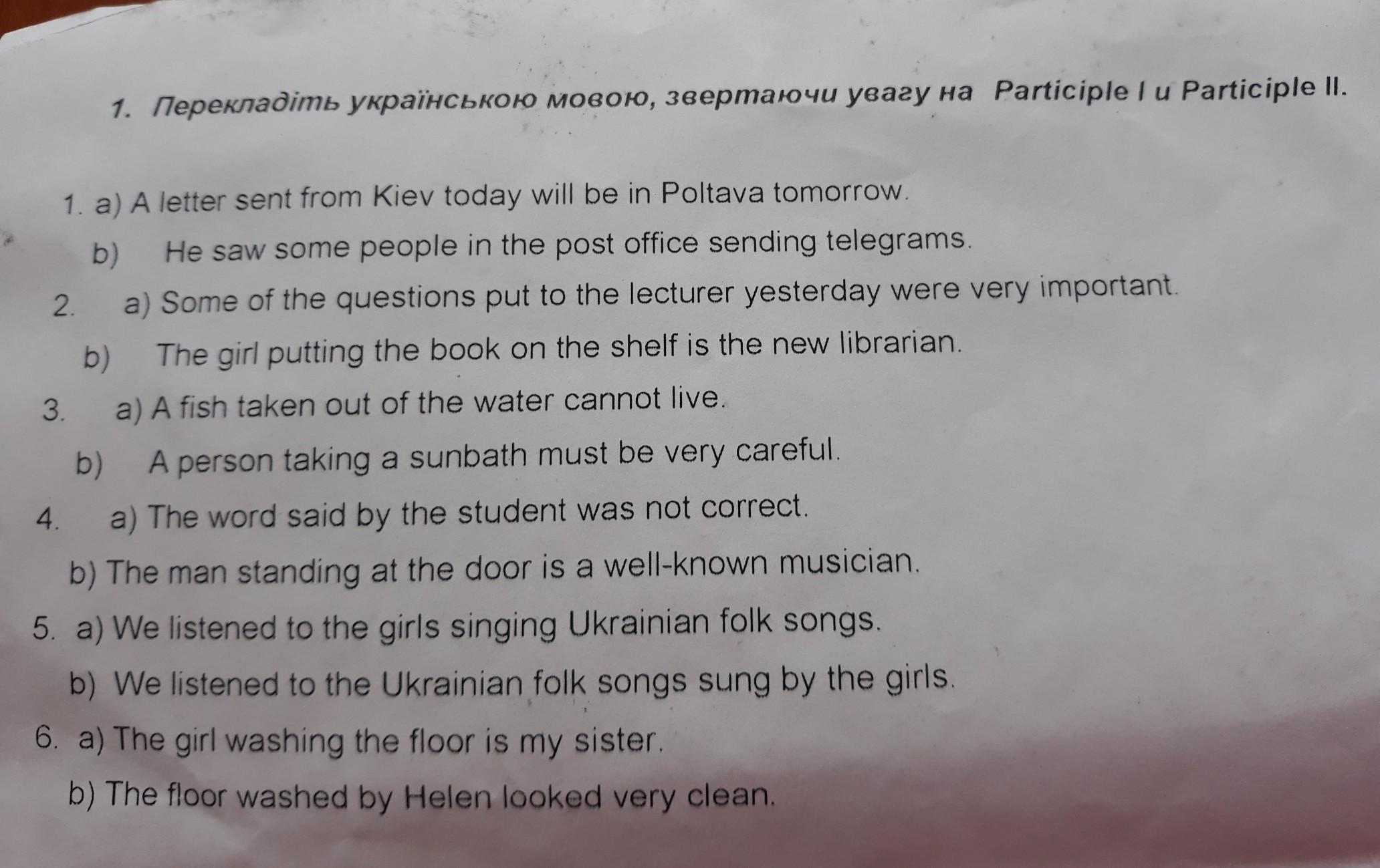 1. а) Лист, надісланий сьогодні з Києва, завтра буде в Полтаві. б) Він бачив, як деякі люди на пошті відправляли телеграми. 2 3 а) Деякі питання, поставлені вчора лектору, були дуже важливими. б) Дівчина, яка ставить книгу на полицю, є новим бібліотекарем. а) Риба, вийнята з води, не може жити. б) Людина, яка приймає сонячні ванни, повинна бути дуже обережною 4 а) Слово, сказане учнем, було неправильним. б) Чоловік, який стоїть біля дверей, — відомий музикант. 5. а ) Ми слухали , як дівчата співали українські народні пісні . б) Ми слухали українські народні пісні, які співали дівчата. 6 а ) Дівчина , що мила підлогу -- моя сестра б ) Підлога , яку вимила Хелен , виглядала дуже чистою