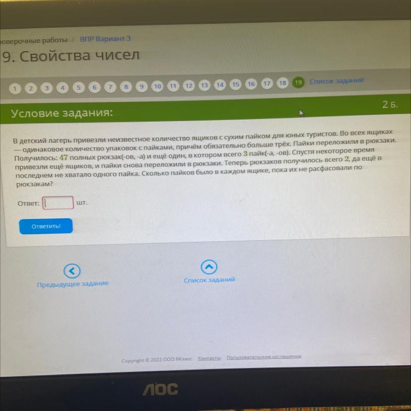 последнем не хватало одного пайка. Сколько пайков было в каждом ящике, пока их не расфасовали по
