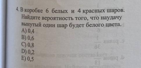 4. В коробке 6 белых и 4 красных шаров. Найдите вероятность того, что наудачу ВЫНУТЫЙ один шар будет белого цвета. A) 0,4 B) 0,6 C) 0,8 D) 0,2 E) 0,5 DE 81