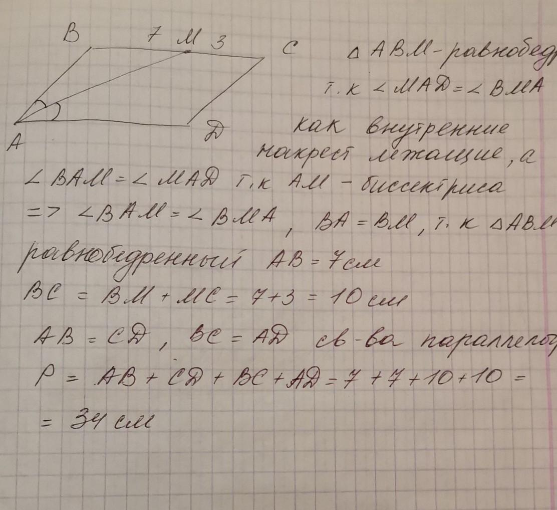 бісектриса гострого кута A паралелограма abcd ділить сторону bc на відрізки 7 см і 3 см, починаючи з вершини b. Знайдіть периметр парелогоама.