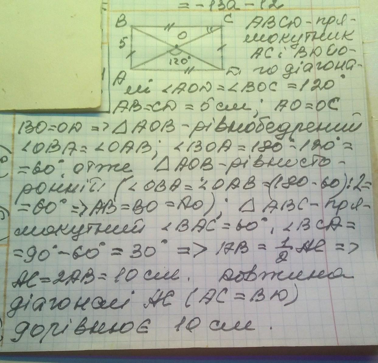У прямокутнику один із кутів, утворених діагоналями, дорівнює 120°. Менша сторона