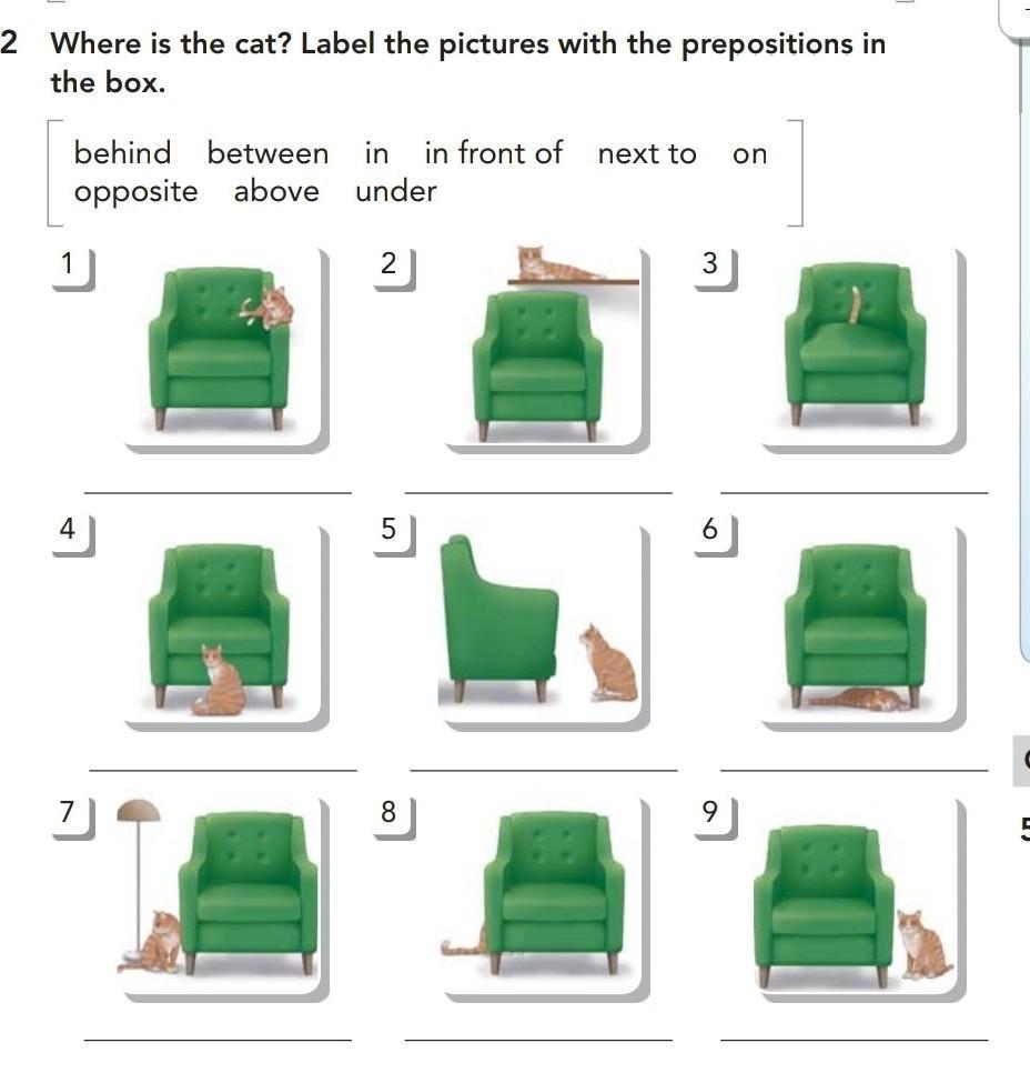 5 opposite; 6 under; 7 between the lamp and the armchair;