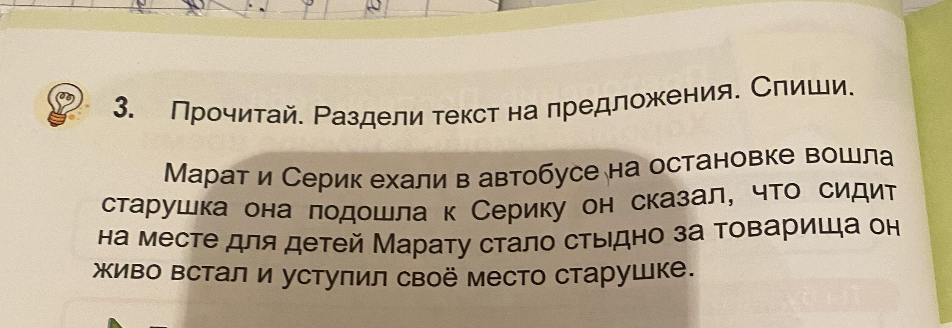 Марат и Серик ехали в автобусе. На остановке вошла старушка. Она подошла к Серику. Он сказал, что сидит на месте для детей. Марату стало стыдно за товарища. Он живо встал и уступил место старушке.