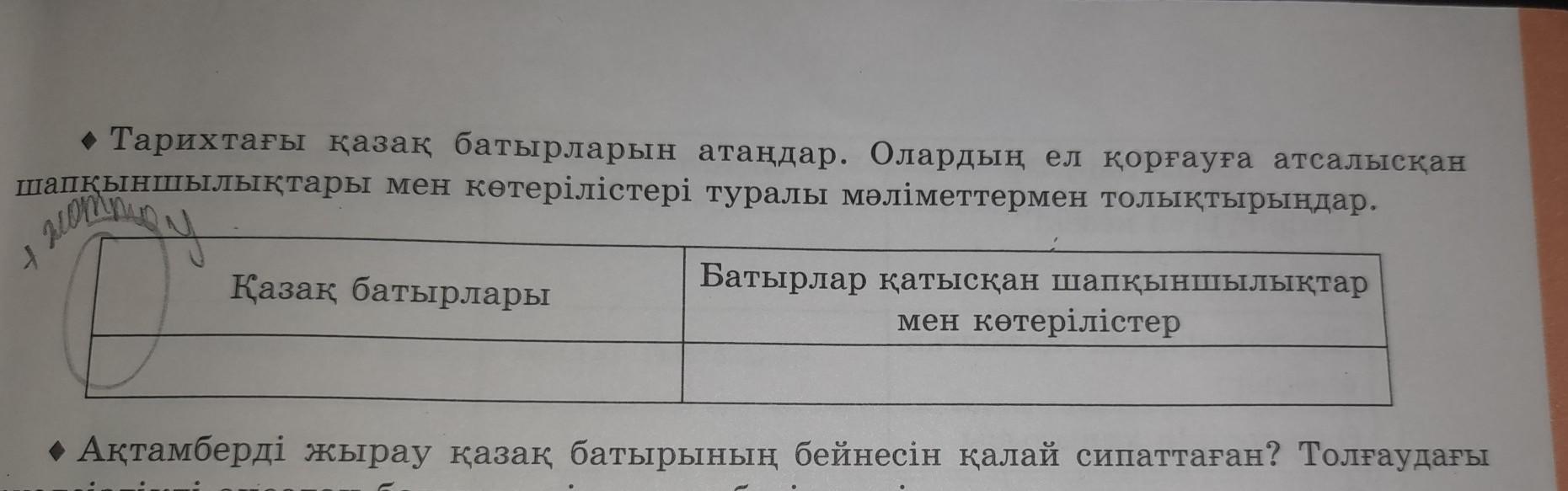 Тарихтағы қазақ батырларын атаңдар. Олардың ел қорғауға атсалысқан шапқыншылықтары мен көтерілістері туралы мәліметтермен толықтырыңдар