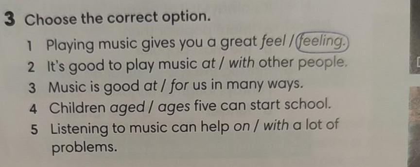 3 Choose the correct option. 1 Playing music gives you a great feel/feeling) 2 It's good to play music at / with other people. Music is good at / for us in many ways. 3 Children aged/ages five can start school. 5 Listening to music can help on / with a lot of problems.