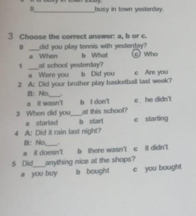 3 Choose the correct answer: a, b or c. odid you play tennis with yesterday? When b What a at school yesterday? Were you 1 a b Did you c Are you 2 A: Did your brother play basketball last week? B: No c. he didn't b I don't at this school? b start Who a it wasn't 3 When did you a started 4 A: Did it rain last night? B: No c starting a it doesn't b there wasn't c it didn't 5 Did anything nice at the shops? a you buy b bought c you bought
