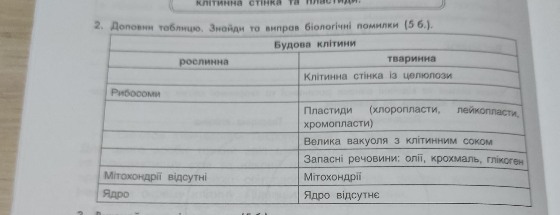2. Доповни таблицю. Знайди та виправ біологічні помилки (5 б.). Будова клітини Рибосоми рослинна Мітохондрії відсутні Ядро тваринна Клітинна стінка iз целюлози Пластиди (хлоропласти, хромопласти) лейкопласти, Велика вакуоля з клітинним соком Запасні речовини: олії, крохмаль, глікоген Мітохондрії Ядро відсутнє СРОЧНО ОЧЕНЬ НАДО!!!!!!