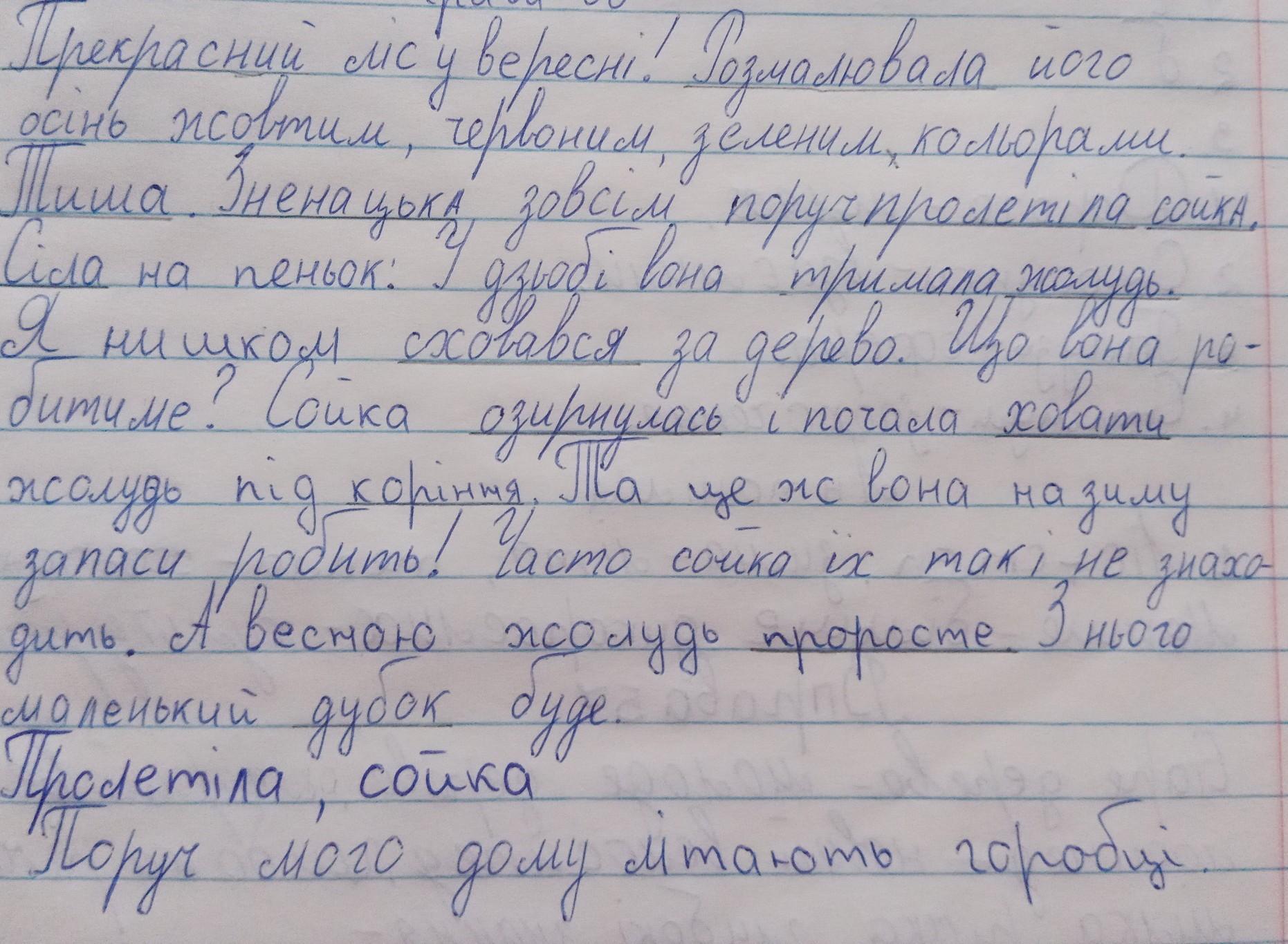 60. 1. Спишіть текст, замінюючи виділені слова синонімами. Чудовий ліс у вересні! Розфарбувала його осінь жовтим, червоним, зеленим кольорами. Тиша. Раптом зовсім близь- ко пролетіла сойка. Сіла на пеньок. У дзьобі вона держала жолудь. Я тихенько сховався за дерево. Що вона робитиме? Сойка огляділась і почала ховати жолудь під коріння. Та це ж вона на зиму запаси робить! Часто сойка їх так і не знаходить. А весною жолудь проросте. З нього маленький дубок буде (З посібника). II. Виконайте завдання. 1. Підкресліть ключові слова. Розкажіть, яким ви уявляєте цей ліс у березні. 2. Випишіть по одному багатозначному й однозначному слову. 3. Складіть і запишіть одне речення із синонімами про ліс або пта- хів.