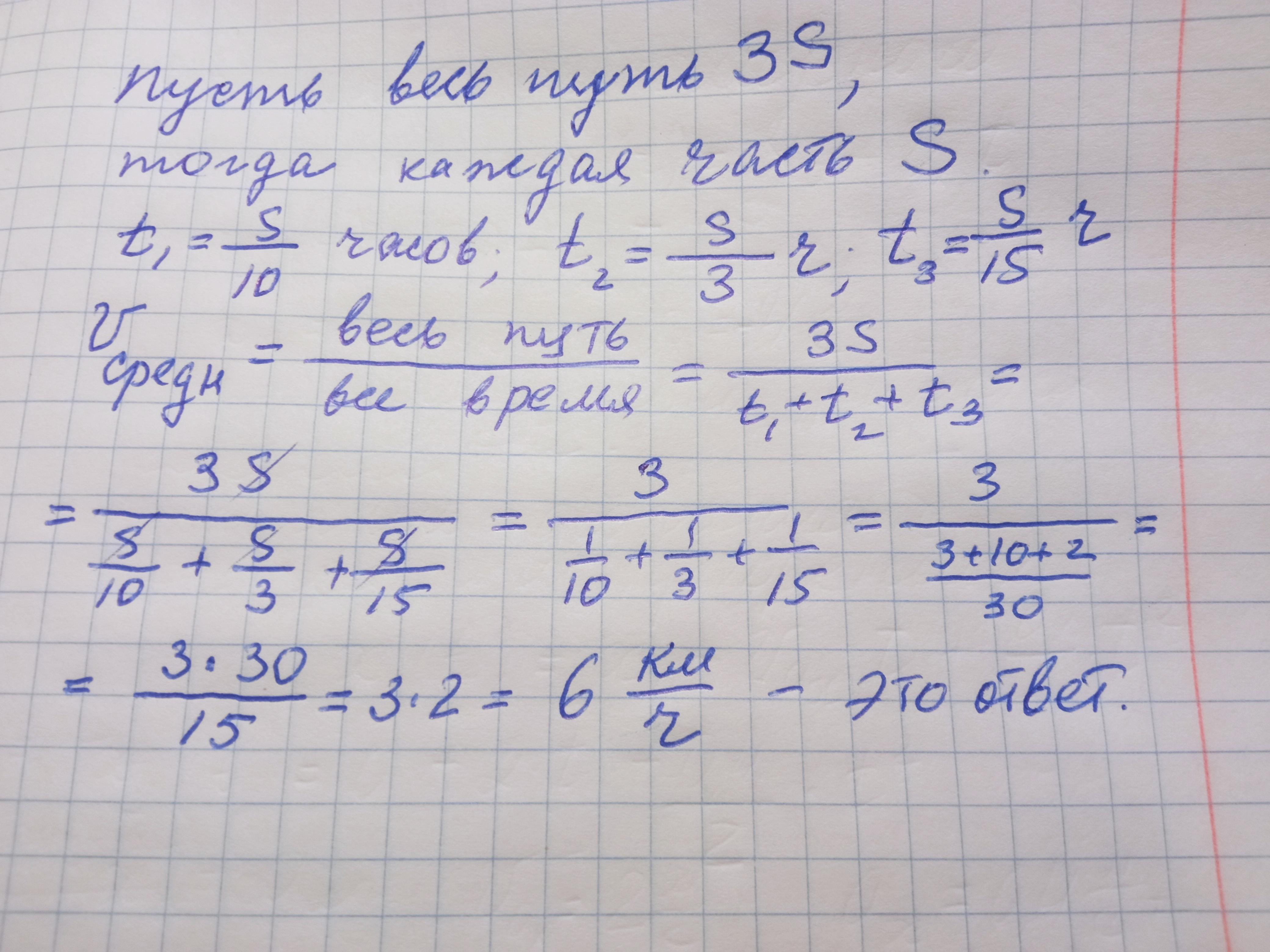 человек шёл по прямолинейной траектории 1/3 часть пути со скоростью 10км/ч затем 1/3 часть пути со скоростью 3 км/ч и ещё 1/3 часть пути со скоростью 15 км/ч. определить среднюю скорость человека.