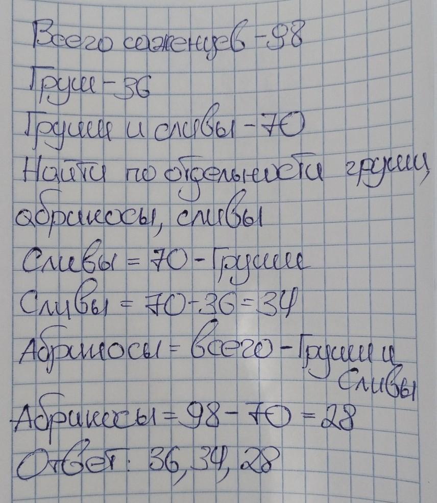 А можете пожалуйста помочь:на семейной ферме высадили 98 саженцев плодовых деревьев:груши,сливы,абрикосы.Известно , что груш-36 деревьев , а груш и слив -70 деревьев.Сколько высадили саженцев абрикосов и слив по отдельности