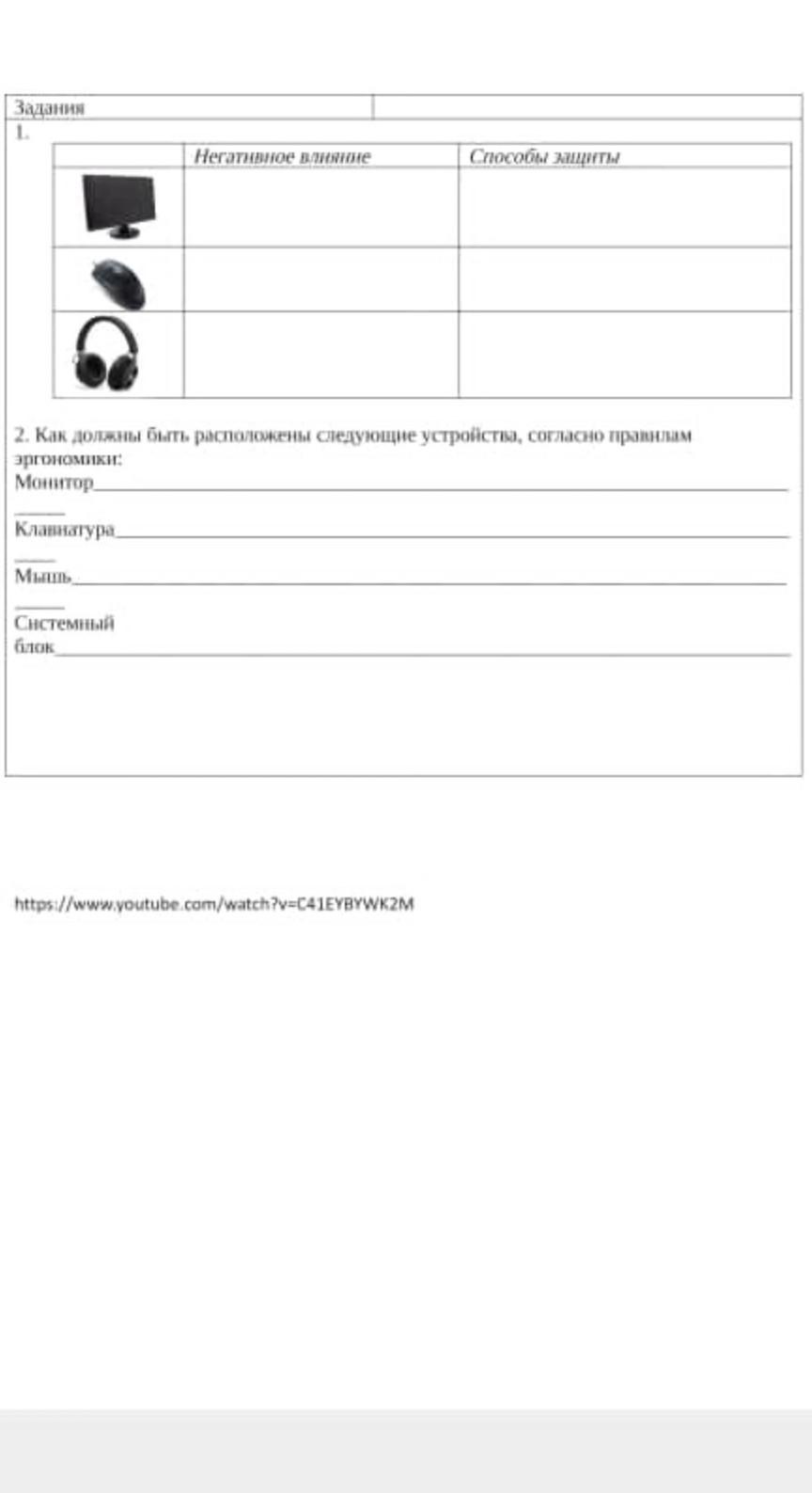 Ответ: компьютер- негативное влияние: может испортить зрение, а способ защиты: работы по установки антивирусной программы. запрет на открытие вложений находящихся в электронной почте.Мышка:Нег.влияние Онимение ,раздражение .Способ защиты:Не дергать провода ,все делать аккуратно.Наушниуи: влияние: может испортить слух или же будут болеть уши.Спосоь защиты:Не ставить громко источник звука
