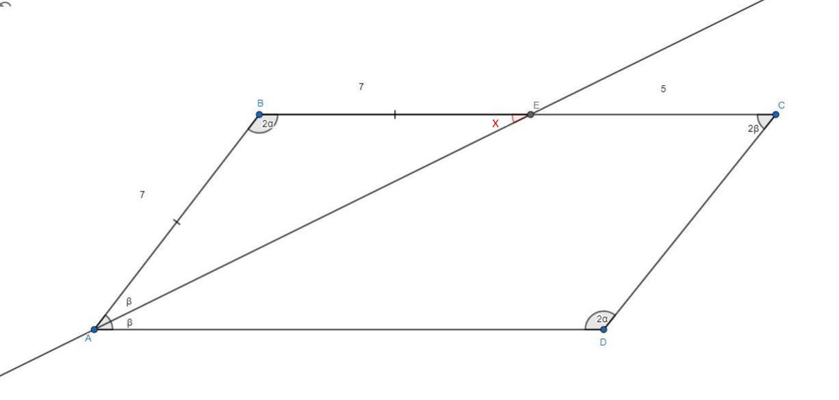 Бісектриса кута паралелограма поділяє одну з його сторiн на вiдрiзки 5см i 7см, рахуючи від кута, протилежного куту, з якого провели бісектрису. Знайти периметр паралелограма.