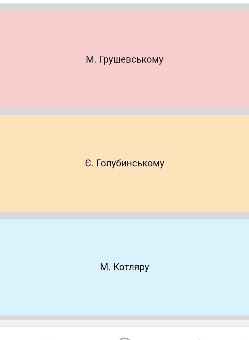 Кому з істориків належить дана оцінка Святослава?" Святослав належить до найбільш виразних і характеристичних фігур між давніми руськими князями... Роль князя- правителя, голови держави, зовсім сходить на другий план перед войовничим ватажком. Це чистий запорожець на київському престолі". М. Грушевському Є. Голубинському М. Котляру