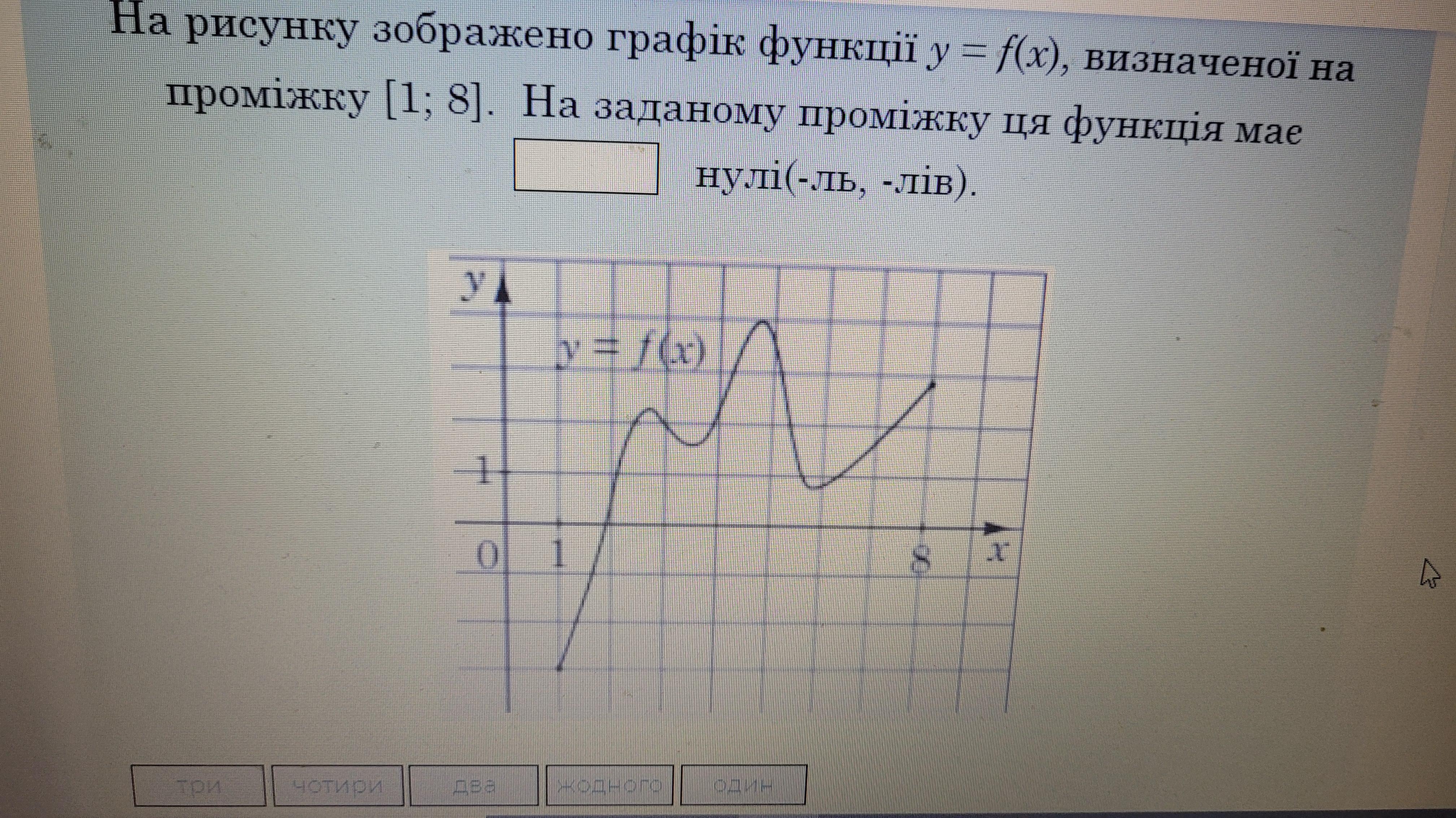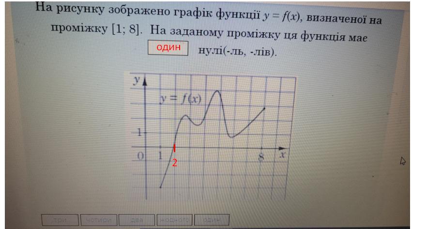Нули функции - это места , в которых график функции пересакается с осью Ох , как видим , функция будет иметь один ноль , это при x = 2