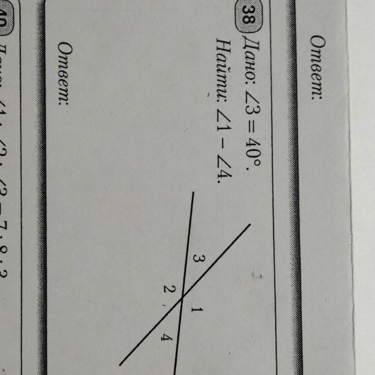 < 3 = < 4 по свойству вертикальных углов => < 4= 40°