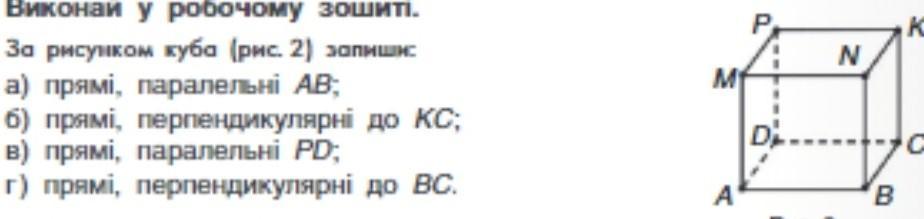 III. Виконаи у робочому зошит. 1. За рисунком куба (рис. 2) залишк а) прямi, паралельнi AB; б) прямi, перпендикулярнi до КС; в) прямi, паралельнi PD; г) прямi, перпендикулярні до ВС.