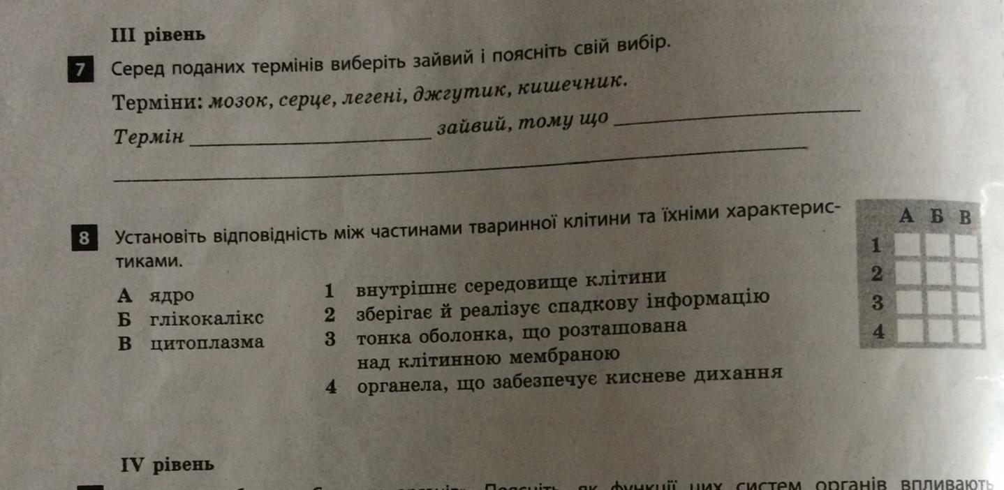 7. Термін джгутик зайвий, тому що всі подані вище терміни органи, а джгутик - це рухома структура, присутня на поверхні багатьох клітин як еукаріотів, так і прокаріотів.