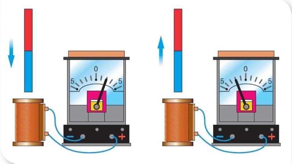 При віддаленні магніту від котушки на її ближньому до магніту боці виникає різнойменний (S) полюс, полярність на гальванометрі протилежна до першого випадку