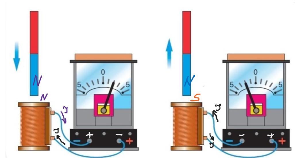 Пояснення: при наближенні магніту до котушки на її ближньому до магніту боці виникає однойменний (N) полюс. Далі за правилом правої руки визначаємо напрям струму у котушці. Струм у гальванометр входить в "+" і виходить з нього з "-"