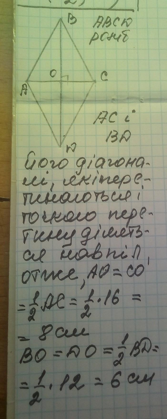 1)Діагоналі ромба ADCD AC i BС перетинаються в точці О. Відомо, що АС=16 см; BD=12 см. Знайдіть OC і OD.