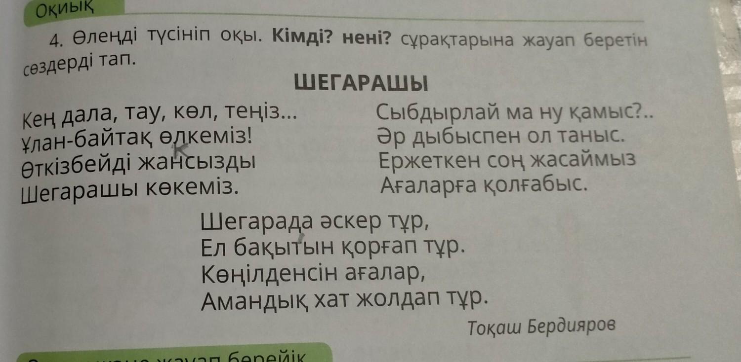 Оқиық 4. Өлендi түсiнiп оқы. Кiмдi? нені? сұрақтарына жауап беретін сөздерді тап, ШЕГАРАШЫ Кең дала, тау, көл, теңіз... хлан-байтақ өлкеміз! Өткiзбейдi жансызды шегарашы көкеміз, Сыбдырлай ма ну камыс?.. Әр дыбыспен ол таныс. Ержеткен соң жасаймыз Ағаларға қолғабыс. Шегарада әскер тұр, Ел бақытын қорғап тұр. Көңілденсін ағалар, Амандық хат жолдап тұр. petik Тоқаш Бердияров ON sts