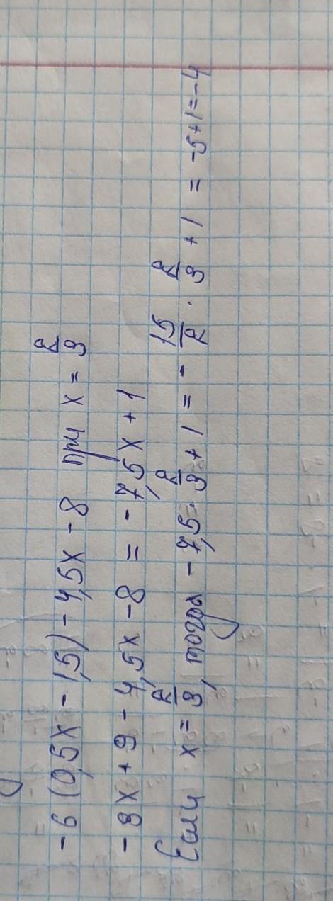 -6 (0,5x - 1,5) - 4,5x- 8=-3x+9-4.5x-8=-7.5x+1 , при x = 2/3.