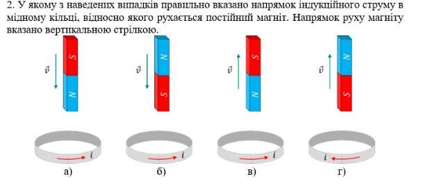 2. У якому з наведених випадків правильно вказано напрямок індукційного струму в мідному кільці, відносно якого рухається постійний магніт. Напрямок руху магніту