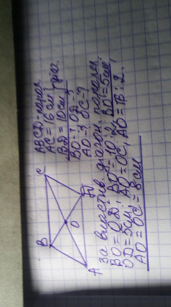 діагоналі паралелограм дорівнюють 10 см і 16 см. знайдіть відстань вершин паралелограм до точки перетину діагоналей